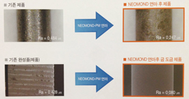 지난해 이 회사는 미세 소자용 나노다이아몬드 연마재 ‘NEOMOND-PM’을 출시했다. 미세 소자는 마이크로(㎛) 크기의 부품으로 반도체 칩과 기기를 연결하는 커넥터가 대표적인 예다. 소자의 표면이 거칠면 도금해도 전기 전도성 효율이 낮다. 표면에 이물질이 낄 가능성도 있어 그 소자가 탑재되는 전자기기의 성능이 떨어지고 제품 안정성이 저하된다.