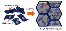 결함밀도가 낮아 기계적 강도가 높은 그래핀을 세라믹 소재 알루미나와 복합화함으로써 기존 소재대비 취성은 3배, 내마모성은 10배 이상 증가됨을 보였다.
