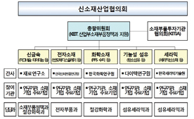 ‘신소재산업협의회’는 총괄분과 및 5대(세라믹, 신금속, 화학소재, 기능성 섬유, 전자소재) 세부 분과로 구성되어 운영된다. 총괄분과 위원장은 민관공동대표(산업정책실장 및 업계 대표 1인)가 맡는다. 사무국 역할은 산업기술평가관리원이 수행하며, 세부분과는 각 산업 소재기업, 수요기업, 연구기관 관계자 50여 명으로 구성된다.