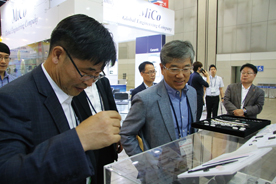 ㈜엠아이디 부스의 제품 설명을 듣는 한국파인세라믹협회 전선규 회장