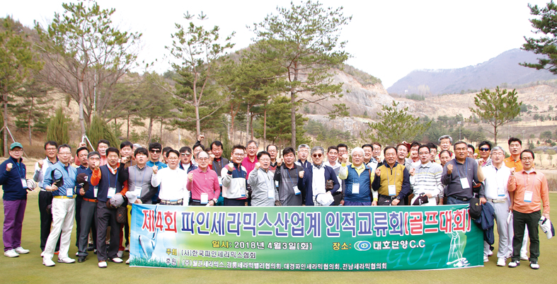 지난달 3일 한국파인세라믹스협회 주최로 ‘제4회 파인세라믹스산업계 인적교류회(골프대회)’가 대호단양C.C에서 개최됐다. 파인세라믹스산업계 인적교류회는 국내 파인세라믹스 산업계 교류와 단합을 위해 2015년부터 매년 열리는 행사다. 이번 행사엔 전선규 한국파인세라믹스협회 회장, 김성인 강원테크노파크 원장, 황호연 ㈜월간세라믹스 회장, 추창오 대동세라믹 대표이사를 포함한 국내 파인세라믹스 산·학·연·관 관계자 50여 명이 참석했다. 이번 인적교류회는 골프대회와 만찬으로 진행됐다. 골프대회는 참가자들이 4명씩 한 조로 나뉘어 신페리오 방식으로 경합을 벌였다. 이날 골프대회는 1조에 속한 전선규 한국파인세라믹스협회 회장, 김성인 강원테크노파크 원장, 황호연 ㈜월간세라믹스 회장, 추창오 대동세라믹 대표이사의 시타로 시작됐다.