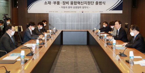 이는 소재·부품·장비산업 경쟁력강화를 위한 특별조치법 시행(’20.4.1)에 맞춰 소부장 기업의 기술력 향상을 효율적으 로 지원하기 위한 것으로 이날 출범식에서는 융합혁신지원단 과 기업 간 협력모델의 첫 번째 사례로 자동차 분야 상생협 력 협약도 체결되었다.