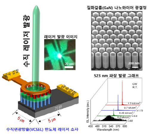 이번에 공동연구팀이 개발한 소자는 질화물계 나노와이어 반도체 구조를 통해 수평이 아닌 수직으로 레이저가 방출이 되며 초소형으로 제작이 가능하고 미세전류로도 구동이 된다. 초고진공상태에서 약 1000℃의 고온 합성을 통해 결함의 비율을 획기적으로 줄인 질화물계 나노와이어 반도체 구조로 설계하고 구조의 간격을 세밀하게 조절해 수평이 아닌 수직으로 레이저가 방출된다.