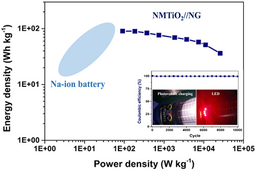 이 하이브리드 저장 소자는 소듐 기반의 배터리에 비해 같은 수준의 저장용량을 유지하면서 300배 이상 빠른 출력 밀도를 보이며, 수십 초 내 급속 충전이 가능해 소형의 휴대용 전자기기 등에 활용 가능할 것으로 기대된다.