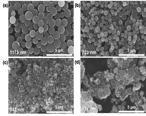 구형 촉매의 주사전자현미경 이미지. 각 촉매의 크기가 (a) 1173 nm, (b) 723 nm, (c) 337 nm, (d) 151 nm 임.