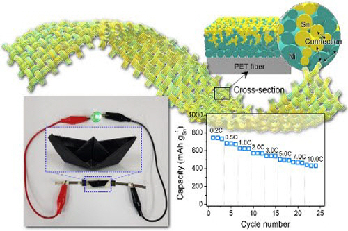 일체형 Sn@Ni 섬유 전극 개념도와 종이 배모양 전극이 적용된 플렉서블 이차전지(자료제공: KETI)