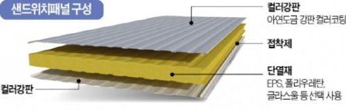 샌드위치패널은 압연 컬러강판 사이에 단열재를 채워넣은 금속제 조립식 건축 복합자재다. 철골 건물의 외장재, 내장재, 지붕재로 사용된다. 단열 성능이 뛰어나고 시공이 간편해 공장, 물류창고, 관공서, 쇼핑센터 등에 다양하게 사용된다.