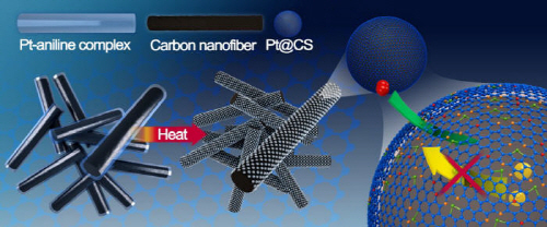연구팀은 백금 이온과 아닐린을 결합, 대량생산에 용이한 열처리 단일공정을 통해 약 1나노미터 두께의 탄소껍질로 둘러싸인 균일한 백금 나노촉매를 제작했다. 백금-아닐린 금속 착물을 탄소 나노섬유에 코팅해 백금 나노입자와 탄소 껍질을 동시에 형성했다. 탄소 껍질이 백금의 용해를 막고 산소는 선택적으로 투과된다. 반응 활성은 유지하고 내구성을 개선할 수 있는 구조임을 제시했다.