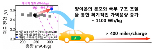 이렇게 개발된 물질은 산소 이온 반응을 극대화해 양극 소재 중에서 가장 높은 에너지 밀도인 1100Wh/㎏ 이상의 가역 에너지 밀도를 구현할 수 있다. 기존 리튬 과량 양극 소재들의 에너지 밀도보다 30% 이상 증가한 수치다. 뿐만 아니라 리튬 과량 물질을 사용하는 전지에서 나타나는 전압 강하 문제를 획기적으로 안정화할 수 있음을 확인했다.