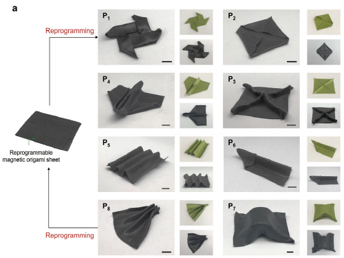 또 개발한 복합 소재로 ´셀프 종이 접기´가 가능한 자성 소프트 액추에이터까지 만들었다. 연구팀은 액추에이터의 자화 형태를 실제 작동 환경 (in situ)에서 재설계하고, 이를 자기장에 노출시켜 복잡한 3차원 형태를 다양하게 구현한 것이다. 가역 반응을 이용하기 때문에 동일한 액추에이터에 반복적으로 새로운 자화 형태를 입력해도 소재의 성능이 유지된다는 장점이 있다.