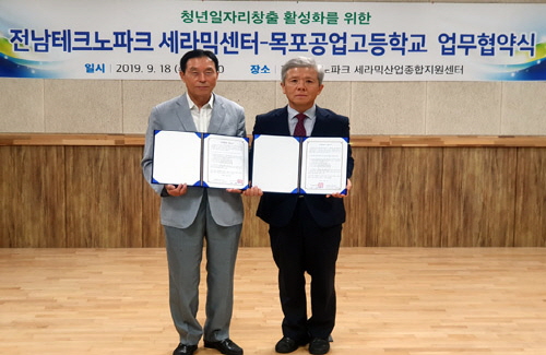 김광진 전남TP 세라믹산업지원센터장(좌)과 김상호 목포공업고등학교장이 협약을 체결하고 기념촬영을 하고 있다.(자료제공 : 전남TP)