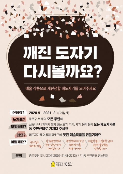 서울 종로구(구청장 김영종)는 깨진 도자기를 수거해 공공미술작품 재료로 쓰도록 하는 ´깨진 도자기 다시 볼까요? 예술 작품으로 재탄생할 폐도자기를 모아주세요´ 사업을 벌인다고 지난달 15일 밝혔다.