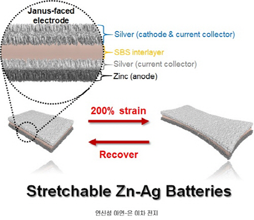 이에 연구팀은 마치 두 개의 얼굴을 가진 로마신화의 신 ‘야누스’처럼 양극과 음극이 한 전극에 구성된 ‘야누스 페이스 전극’을 사용하여 연신성(延伸性, 늘어나는 성질) 아연-은 이차 전지를 개발했다.