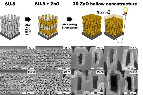홍 교수 연구팀은 문제해결을 위해 근접장 나노 패터닝(Proximity field nanopatterning, PnP) 기술 및 원자층 증착(Atomic layer deposition, ALD) 기술을 이용해 3차원 나노 트러스(truss) 구조를 갖는 산화물 아연(ZnO) 세라믹을 제작했다. 또 나노 인덴테이션 (Nano-indentation) 기술과 압전 감응 힘 현미경(Piezoelectric force microscopy, PFM) 기술을 이용, 제작된 구조체의 높은 기계적 특성과 압전 특성을 입증하는데 성공했다.