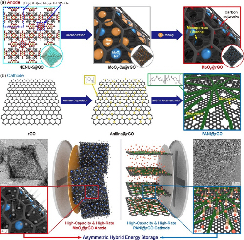 연구팀은 우선 배터리용 음극 재료로 다공성 나노결정인 금속-유기 골격체(Metal-Oraganic Frameworks, MOFs)의 탄화 과정을 통해 5~10 나노미터 크기의 몰리브덴 금속 산화물이 결합된 탄소 구조체를 만들었다. 탄화 과정에서 탄소 구조체를 감싸는 산화 그래핀은 환원되면서 전도성 탄소 결합 형성으로 전기 전도도를 향상시키며, 선택적 금속 식각으로 마이크로 기공이 형성된 다공성 구조를 제작했다.