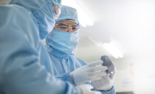 OCI 연구원들이 생산된 폴리실리콘을 살펴보고 있다.(자료제공: OCI)