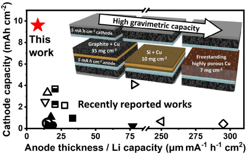 모식도는 집전체, 양극, 분리막, 음극으로 이루어진 배터리의 구성요소를 나타낸다. 개발한 다공성 구리 구조체는 전도성을 갖기 때문에 무거운 집전체를 추가로 사용할 필요가 없으며, 높은 기공률 덕분에 적은 무게로 많은 양의 리튬을 저장할 수 있다. 이는 차세대 음극 재료로서 각광받던 실리콘의 이론상 한계 용량보다 높은 용량을 갖을 수 있다는 것을 뜻하며, 기존 흑연 음극보다 5배까지 가벼운 음극을 만들 수 있다는 것을 뜻한다. 본 연구 결과는 기존 연구들과 비교하여 동일한 양을 저장하는데 필요한 전극의 두께를 2배 이상 줄였으며, 양극 또한 면적당 용량이 5 mA h cm-2으로 높은 양극을 채택하여 실제 상용화되고 배터리와 동일한 수준의 환경에서 테스트한 결과이다.