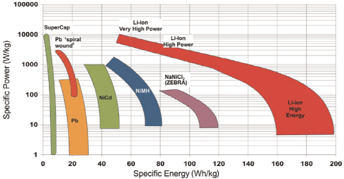 그림 1. 이차전지별 에너지밀도 및 출력밀도 비교(Ragone Plot)[2]