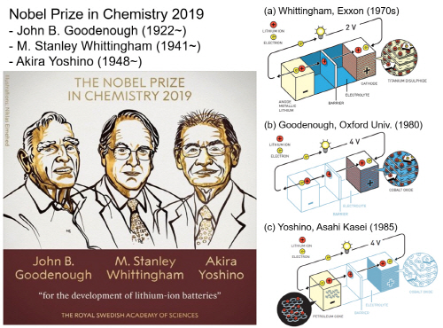 그림 2. 리튬이온전지 개발로 화석에너지 시대의 종식 가능성을 열어준 노벨화학상(2019) 수상자들 및 이들이 개발한 핵심 소재