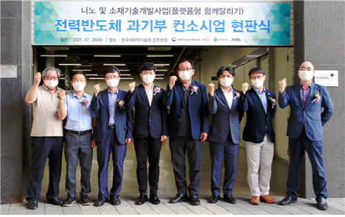 한국세라믹기술원(원장 유광수)은 7월 20일 진주 본원에서 과학기술정보통신부의 나노 및 소재기술개발사업을 통해 전력반도체용 고품질 산화갈륨(Ga₂O₃) 단결정 기판 제조기술을 본격적으로 개발하기 위한 ‘전력반도체 과기부 컨소시엄’ 현판식을 가졌다고 밝혔다. 이날 현판식에는 이영국 한국연구재단 소재·부품단장, 배시영 총괄책임자 등 컨소시엄 관계자 10명이 참석했다.