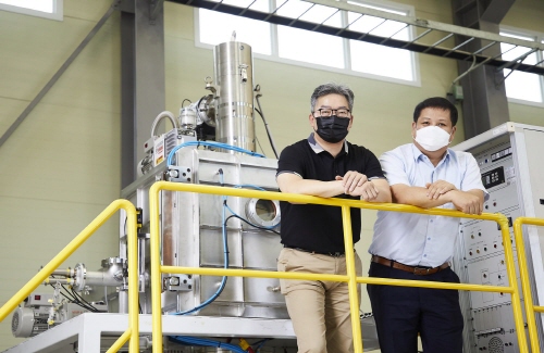 공동 개발한 초고순도 몰리브덴 정련 장비 앞에서 생기원 박경태 박사(右)와 ㈜엔에이티엠 김인호 대표(左). (자료제공: 생기원)