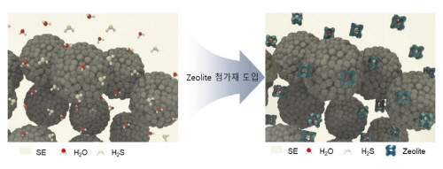 이번에 개발한 소재 기술은 고체전해질에 제올라이트 나노입자를 소량 첨가·합성함으로써 황화수소 발생을 감소시키는 것이 핵심으로, 대기 내 수분과 황화수소 가스를 동시에 흡착하는 제올라이트의 특성을 활용했다.