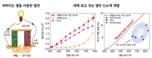 이번 연구에서는 다결정 소재들이 낮은 성능을 가지는 근본적 원인을 밝히고, 이를 원천적으로 해결하는 새로운 합성 공정법이 개발됐다. 그 결과 해당 신소재는 역사상 최초로 열전성능지수 3.1이 넘는 초고성능 발전 성능을 보였으며, 열에너지를 전기에너지로 변환하는 발전 효율이 20%를 넘는 세계 최고 기록을 나타냈다.