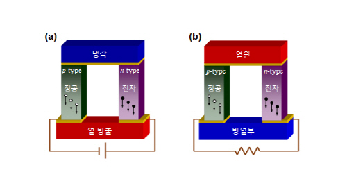 그림 1. (a) 열전냉각 및 (b) 열전발전 모듈 구동 원리