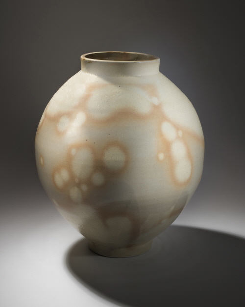 분장된 분청 위에 옅은 붉은 반점들이 꽃잎처럼 담담히 피어있다. 장작가마에서 볼 수 있다는 매화 열꽃 꽃핌 현상이다. 장작가마처럼 재가 앉아 철과 반응할 수 있는 조건을 만들어주면 꽃이 핀다.