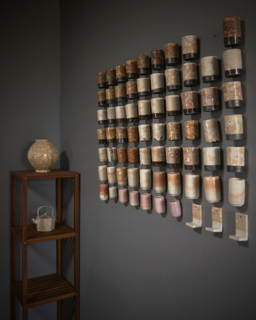 더불어 한 옹기장이 수비한 흙을 일년 이상 묵혀 꼭 겨울을 지나게 한 후 사용한다는 것을 티브이 다큐에서 봤다. 그냥 흙을 묵혀서 쓴다고 들었을 수도 있지만, 그는 “흙이 얼었다 녹았다 하며 물분자가 변하지 않을까 하는 생각으로 냉동고에 흙을 얼리는 실험을 하고 있다.” 여러 상태의 흙, 그 흙으로 만든 태토와 유약을 교차 사용하며 데이터를 쌓아가고 있다. 작은 가마를 사용하며 한 달에 한두번씩 테스트할 수도 있어 비교적 짧은 시간에 많은 데이터가 쌓였다. 작업실 한켠을 채우고 있는 시편들이 반증한다. 이 밖에도 근처에 장작가마 작업하는 작가와 흙을 나누고 서로의 가마에 시편을 넣으며 교차테스트 하는 것도 데이터를 만드는 데 도움이 많이 된다.