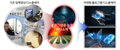 그림 1. 기존 입체영상 디스플레이 한계 극복을 위한 능동 메타소재 개발의 필요성