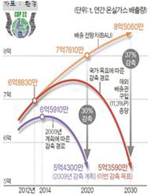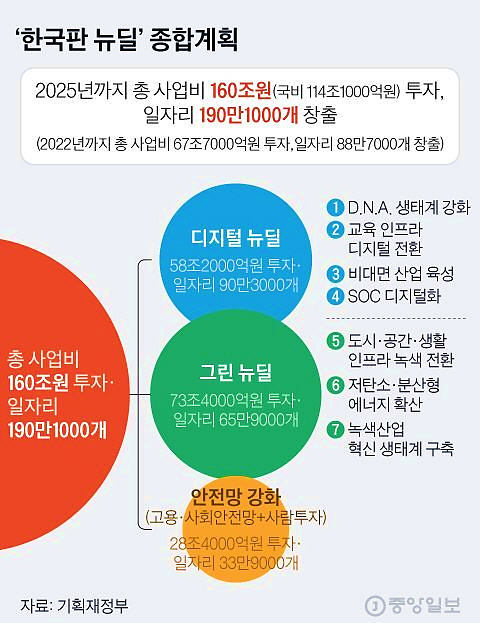 그림 1. (좌) 파리 기후협약에 따른 우리나라의 온실가스 저감 목표 및 (우) 일자리 창출과 환경 개선을 위한 그린 뉴딜 종합계획