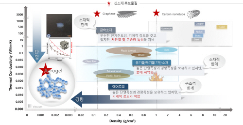 온실가스 감축 목표 달성을 위해서는 무엇보다도 산업시설 및 기자재의 단열성을 강화하여 온실가스의 발생을 막고, 공정 중 방출되는 열에너지의 손실을 최대한으로 막아 에너지의 효율을 향상시키는 방안이 중요하다. 또한 산업 분야에서 필수적으로 이용되는 자동차, 트럭, 비행기 등과 같은 각종 운송 수단에서 연비의 효율을 증대시키기 위해 차체에 경량 소재를 적용하여 중량을 획기적으로 줄이는 방안도 온실가스 저감의 한 방안으로 제안되고 있다. 이러한 이유로 건축·산업 분야에서 단열과 경량화의 중요성은 점점 커지고 있으며, 이러한 문제를 해결할 수 있는 핵심 극한 물성 소재로 다양한 종류의 신소재가 제기되고 있다. 일반적으로 금속소재는 우수한 전기 전도성과 기계적 강도를 가지고 있지만 단열성이 매우 낮고 고중량 특성을 가지며, 일반적인 유/무기 기반 복합 소재의 경우 높은 단열 특성과 경량특성을 보유하고 있지만 고온에 취약하다는 단점이 있다. 이러한 소재적 한계를 극복할 수 있는 극한 물성 신소재 물질로 초다공성 구조를 가지는 무기 에어로겔(aerogel)이 제기될 수 있다.