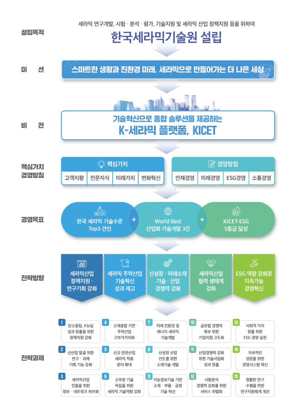 한국세라믹기술원 정연길 원장은 “현재의 세라믹 주력산업 뿐만 아니라 신산업 창출과 미래 환경 위험에 대비할 수 있는 기술을 개발하고, 국가 정책지원 및 산업화로 연결시킬 수 있는 기술혁신을 추진할 것”이라며, “세라믹 관련 종합 솔루션을 제공하는 대한민국의 세라믹을 대표하는 기관이 되려는 의지를 담았다”고 밝혔다.