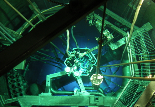 탄화규소 잉곳을 담은 도핑 장치(우측 아래 원통형)가 연구용 원자로 ´하나로´에 들어가고 있다. (자료제공: KAERI)