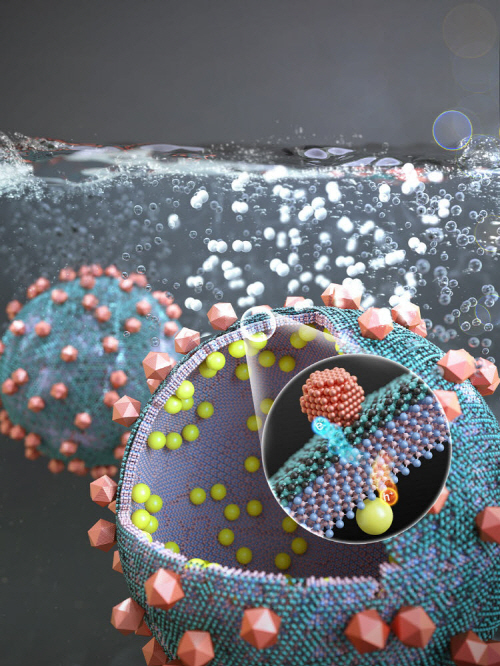 연구팀은 이러한 문제를 ‘한 번에’ 해결한 광촉매를 개발했다. 이 광촉매는 속이 빈 형태의 이산화티타늄에 아주 얇은 질화탄소를 덧씌운 지스킴(Z-scheme) 이종 구조로 만들어졌다. 이종 구조 내외부 표면에는 환원반응을 일으키는 백금과 산화반응을 일으키는 이리듐산화물이 각각 공간적으로 분리돼 더해졌다.