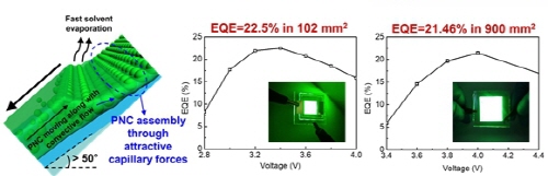 이를 통해 102㎟의 픽셀 크기에서 22.5%의 높은 외부 양자효율 및 높은 재현성을 갖는 대면적 페로브스카이트 발광 다이오드를 성공적으로 제작하였으며 더 나아가 900㎟의 대면적 발광소자에서도 외부 양자효율 21% 이상의 고효율 발광소자를 제작하는데 성공하였다. 이는 현재까지 보고된 100㎟ 이상의 픽셀 크기를 갖는 대면적 페로브스카이트 발광 소자 중 최고 수치이다.