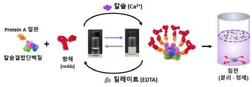 이러한 한계를 극복하고자 연구팀은 칼슘에 의해 침전할 수 있는 칼슘결합 단백질과 항체 결합 기능을 가진 Protein A 절편(조각)을 결합한 융합단백질을 개발하여 Protein A 크로마토그래피를 대체하는 정제방법을 개발하였다.