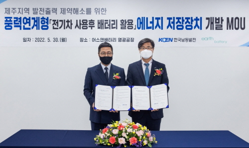 남동발전(사장 김회천)은 배터리 리사이클 전문업체인 어스앤배터리(대표 박수철)와 5월 30일 어스앤배터리 전남 영광 본사에서 ‘풍력연계형 전기차 사용 후 배터리를 활용한 에너지저장장치(UBESS) 개발’에 관한 업무협약을 체결했다고 밝혔다.