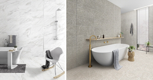 신제품 ‘베나토(Venato)’는 최근 국내에서 인기를 끄는 가늘고 섬세한 까라라 베인 패턴을 적용해 천연 대리석 타일로 시공한 듯한 효과를 선사한다. ‘아쿠아 스톤(Aqua Stone)’은 파도의 물결, 모래처럼 반짝이는 물의 표면에서 영감을 받은 디자인으로, 리조트나 휴양지 욕실처럼 고급스러운 공간을 완성해 준다. ‘글림(Gleam)’은 금속이 산화된 듯한 독특하고 매력적인 질감을 구현해 모던 인더스트리얼 인테리어를 연출할 수 있다.