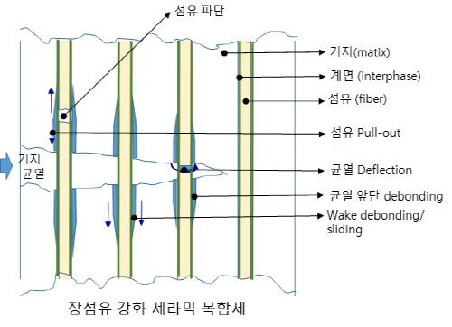 이 글의 제목에는 2가지 중요한 의미를 담고 있다. 첫째가 ‘연속 세라믹 섬유 강화 세라믹 복합재이고 둘째가 ‘고온용’이다. 연속 세라믹 섬유 강화 세라믹 복합체는 영어로 Continuous Ceramic Fiber Reinforced Ceramic (matrix) Composite (CFCC)이다. 즉, 장섬유로 세라믹 기지상을 강화하여 인성을 향상시킨 세라믹 복합재 (이하 장섬유 복합재로 함)를 의미한다. 이러한 특징을 지니기 위해서 장섬유 복합재는 세라믹 섬유, 세라믹 기지상 (matrix phase)과 섬유/기지상간의 계면으로 구성된다. 특히 계면은 장섬유 복합체의 섬유와 기지상의 결합 강도 특성에 영향을 미쳐 복합체가 응력을 받았을 때 균열이 전파되는 경로에 큰 영향을 미치며, 복합체의 파괴인성 특성을 결정할 수 있다. 그림 1에 복합체가 응력을 받았을 때 균열이 전파되는 경로를 나타내었다. 단미(monolith) 세라믹스의 급격한 파괴를 발생하는 균열전파 경로에 비하여 장섬유 복합체에서는 균열 편향 (deflection), 계면 분리(de-bonding), 슬라이딩(sliding), 섬유 pull-out과 같은 복잡한 균열전파 경로가 추가되어 복합체의 파단을 복잡하게 유도하며, 일반적으로 취성 파괴를 나타내는 세라믹의 파괴인성 증진을 가져온다[1].