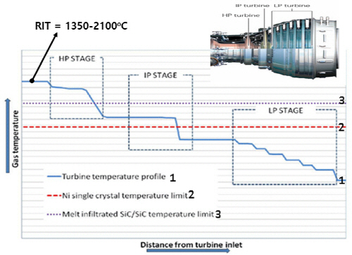 또 다른 중요한 의미인 ‘고온’이다. 재료의 특성 변화와 재료가 적용될 운전온도는 깊은 상관관계를 가지고 있다. 그림 2에 장섬유 복합체가 적용되는 가스터빈 엔진의 길이 방향으로 온도와 압력 분포를 나타내었다[2]. 고압부 (HP Stage로 표시)는 연소기 부근으로 연료의 연소에 따른 고온과 고압이 발생하는 지점으로 1350~2100oC의 고온에서 견딜 수 있는 재료가 필요하다. 이 지점으로부터 배기 쪽으로 멀어지면 온도는 계속 감소하게 되며, 가스터빈 전체의 온도 분포는 선1 (파란색 실선)로 표시된 바와 같다. 선2 (빨간색 긴 점선)는 니켈 단결정이 적용될 수 있는 한계온도를 나타내며, 선3 (보라색 짧은 점선)은 용융 금속 함침법(제조 방법은 뒤에서 설명함)으로 제조한 SiCf/SiC 복합체의 적용 한계온도를 나타내고 있다. 니켈계 합금은 저압부와 중압부의 일부 부품만 적용할 수 있으며, 용융 금속이 합침 된 SiCf/SiC 복합체는 고압부의 일부 부품은 적용할 수 없음을 알 수 있다. 고압부의 고온 영역에서는 1500~1700oC 및 그 이상 온도에서 사용할 수 있는 재료를 요구하고 있다. 그림 3에 온도에 따른 재료의 기계적 강도 변화를 나타내었다. 많은 고온용 금속들이 특정 온도 부근에서 급격하게 강도의 열화가 나타남을 알 수 있다. 반면 장섬유 복합체는 고온까지 강도의 열화 없이 우수한 고온 강도를 유지하고 있다[3-5].