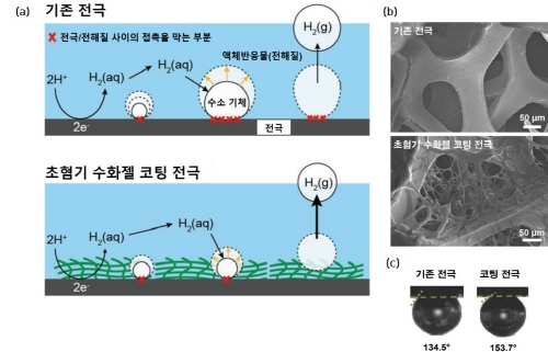 연구팀은 이 문제를 해결하기 위해 전극에 수화젤을 코팅하는 기술을 개발했다. 수화젤은 물을 잘 빨아들여 기저귀, 소프트 렌즈 재료 등으로 쓰이는 물질이다. 이 물질을 전극에 코팅하게 되면 기체보다 물을 훨씬 더 좋아하는 성질(초혐기성) 덕분에 기체가 밀려나게 된다.