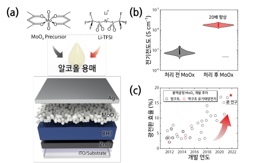 이번 성과는 빛을 전기에너지로 변환하는 효율(광전변환효율)을 높이고제작공정을 단순화·안정화할 수 있어 유기태양전지의 상용화를 앞당기는 데 기여할 것으로 기대된다. 유기태양전지(organic photovoltaics, OPV)는 유기물 반도체를 광활성층으로 하는 차세대 태양전지로, 생산 비용이 낮고 가벼울 뿐만 아니라 소자를 유연하게 구현할 수 있음유기태양전지의 필수 소재로 사용되는 몰리브덴 산화물(MoO₃)은 몰리브덴 금속 원자에 산소 원자가 결합한 형태의 화합물로서 투명한 전기전도성 박막이다. 몰리브덴에 기능성 유기물이 결합된 유무기 하이브리드 화학소재를 이용한 유기졸겔합성법은 잉크를 통해 금속산화물 박막을 형성하는 공정으로, 기존 진공 열증착 공정을 대체할 수 있다. 그러나 이 박막에 높은 전기적 성능을 이끌어내기 위해서는 금속산화물만의 네트워크가 치밀하게 형성되는 과정이 필수적인데, 이러한 과정은 200°C 이상의 고온 후공정이 필요해 그 실용성에 문제가 있었다.
