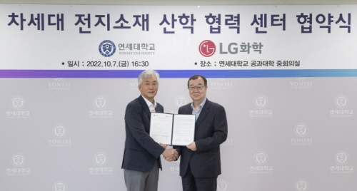 LG화학은 10월 7일 서울시 서대문구 연세대 신촌캠퍼스에서 연세대와 ‘전지 소재 산학협력센터’ 설립을 위한 업무제휴 협약서(MOU)를 체결했다고 밝혔다. 협약식에는 LG화학 유지영 CTO를 비롯해 연세대학교 명재민 공과대학장과 화공생명공학부 이상영 교수 등이 참석했다.