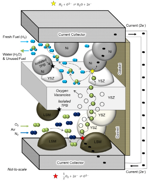 SOFC는 전해질로 고체상의 산소 이온 전도성 세라믹을 사용하며, 고온에서 작동하는 특징을 가지고 있다. 높은 작동 온도로 인하여 추가적인 가스 개질 필요 없이 다양한 종류의 연료를 사용할 수 있으며, 에너지 변환 효율이 높다는 장점을 가지고 있다. SOFC 셀은 크게 연료극(Anode), 공기극(Cathode), 전해질(Electrolyte)으로 이뤄져 있다. 연료극은 수소 등의 연료가스가 공급되면 Ni과 같은 전자전도체와 Yttria Stabilized Zirconia(YSZ) 혹은 Scandia Stabilized Zirconia(ScSZ)와 같은 이온전도체로 이뤄진 복합체를 가장 널리 쓰인다. 공기극은 전자전도체인 Pervskite 구조의 Lathanum Strontium Manganite(LSM), Lathanum Strontium Cobalt Ferrite(LSCF), Lathanum Strontium Cobaltite(LSC) 등을 사용한다. 전해질은 연료극과 공기극 사이에 위치하고 수소 등 연료 가스와 산소와 같은 가스가 혼합되지 않도록 치밀해야하며, 이온전도성을 가지고 있는 YSZ 혹은 ScSZ 등의 재료를 주로 사용한다. SOFC의 작동 원리는 아래 그림 2에 간략하게 나타내었다.
