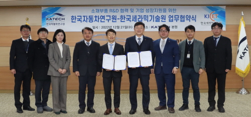 한국자동차연구원(원장 나승식, 이하 한자연)은 한국세라믹기술원(원장 정연길, 이하 KICET)과 12월 21일 충남 천안시 풍세면에 위치한 한국자동차연구원 본원에서 R&D 공동협력 및 기업 성장지원을 위한 상호 업무협약을 체결했다고 밝혔다.