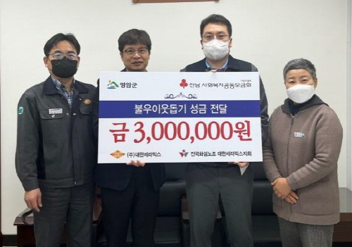 (주)대한세라믹스(대표 이종근)는 1월 19일, 설 명절을 맞아 어려운 이웃을 위해 사용해 달라는 뜻과 함께 노사 협의를 거쳐 모금한 성금 300만 원을 영암군 삼호읍에 기탁했다.