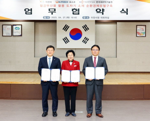 포스코는 4월 27일 이천시청에서 이천시, 한국세라믹기술원과 부산물 활용 도자기 소재 순환경제모델구축을 위해 업무협약을 체결했다고 28일 밝혔다.