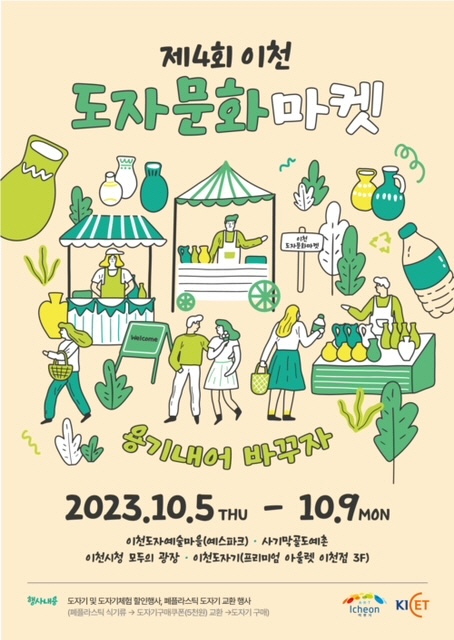 지난 10월 5일부터 9일까지 5일간 이천도자예술마을(예스파크), 사기막골도예촌, 이천시청 모두의 광장, 덕평자연휴게소 4개의 행사장에서 진행된 이번 도자문화마켓 행사는 이천시와 한국세라믹기술원이 ‘용기내어 바꾸자’를 주제로 플라스틱, 일회용 식기 대신 친환경 도자기 사용을 독려하고, 이천 도자기 판매를 촉진하기 위해 추진했다.